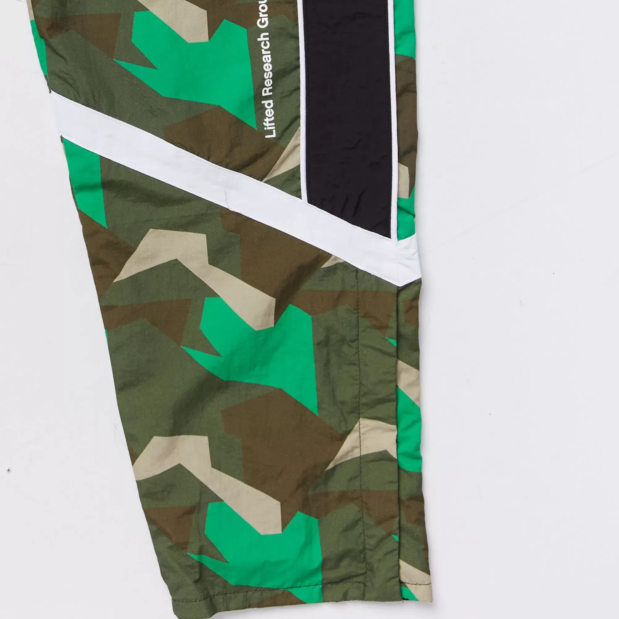 The Lifted Geo Track Pant In Green Features An All-Over Green Geo Camo Print With Black Details Down The Sides, Elastic Waistband, Two Hand Pockets, And Bottom Zips At Ankle.100% Nyloninseam: 28.5″Relaxed Fitoption For Zip At Bottom Hem